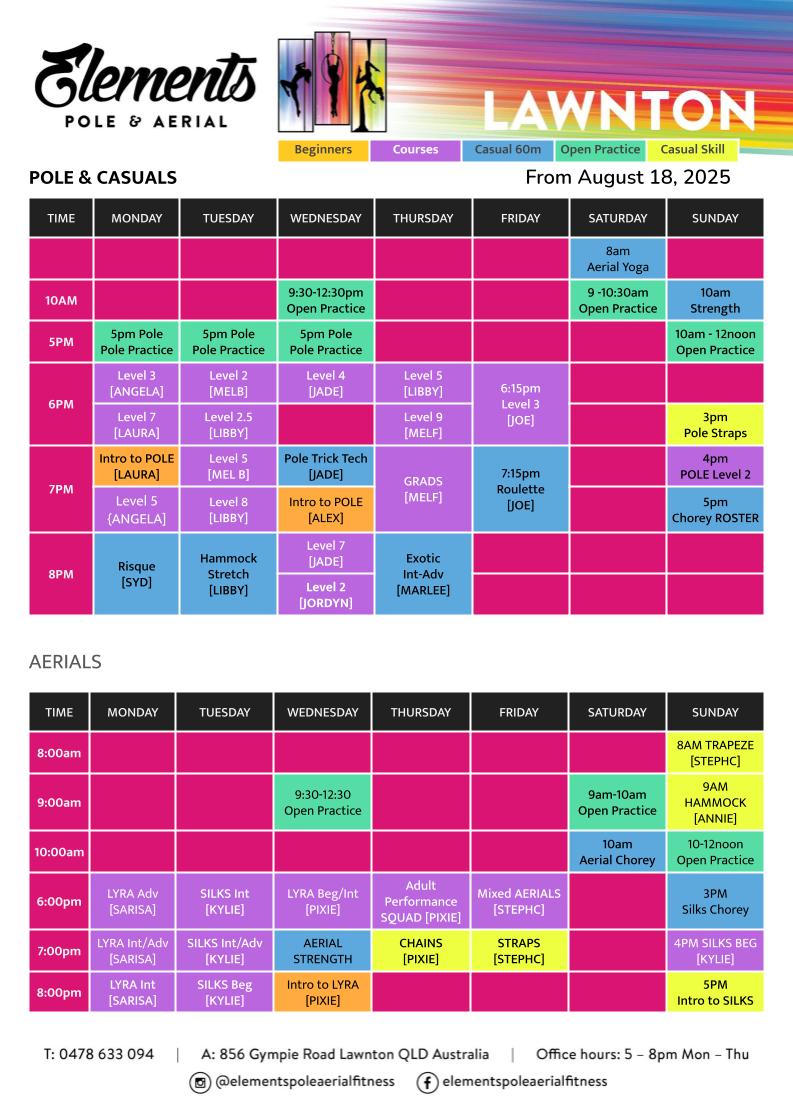 Below is our Casual timetable for Tingalpa. Anyone can book into our casual classes even if you don’t have a membership. Casual Bookings open up 7 days prior to the class. If you a beginner wanting to join us for a Course please check out the Beginner Course Page.