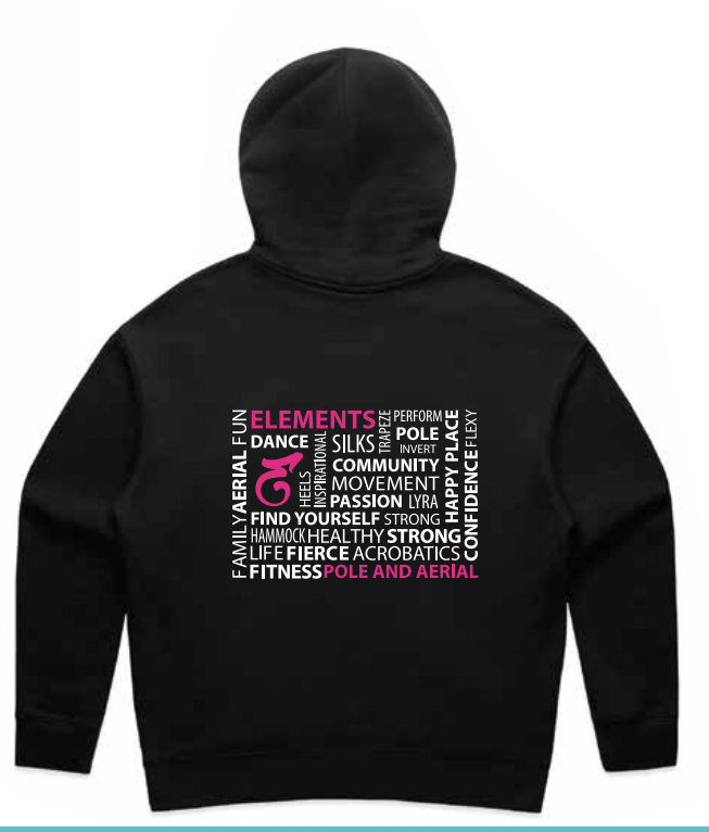 Choose between a hoody with pockets or hoody with zip and pockets. A variety of colours and sizes ranging from youth to adults. Any questions please email us at lawnton@elementspoleaerialfitness.com